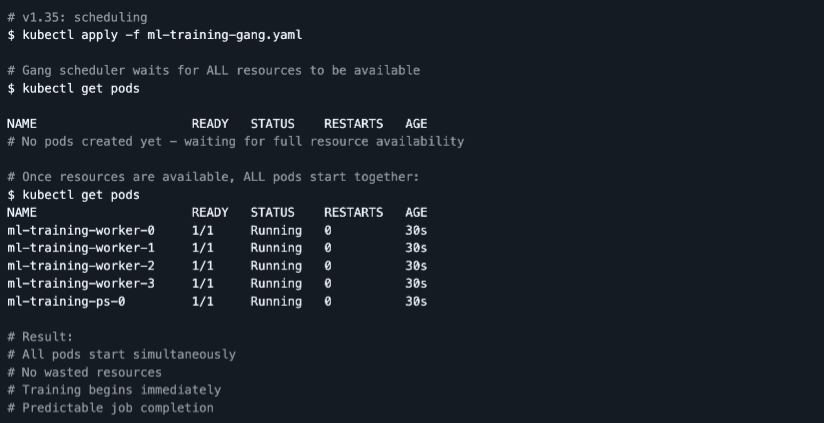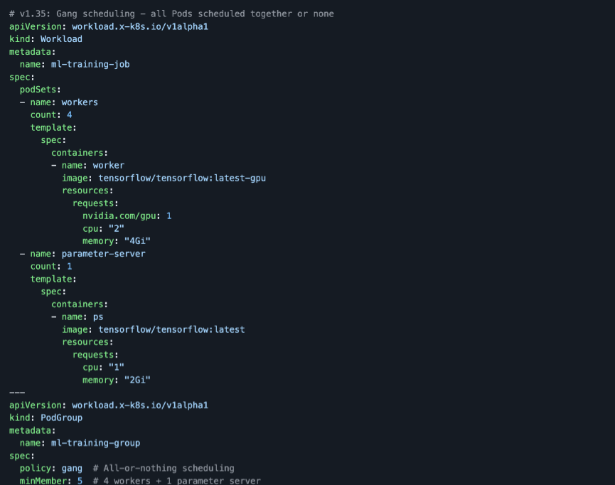 v1.35 introduces Workload‑Aware Scheduling and improvements around gang / batch scheduling semantics as alpha features, allowing schedulers to treat related Pods as a unit and reason about their collective resource needs.